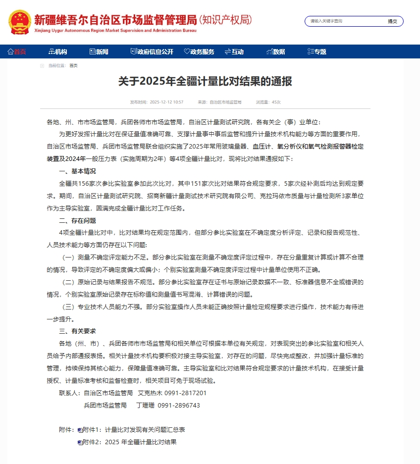 近日,新疆維吾爾自治區(qū)市場監(jiān)督管理局發(fā)布《關(guān)于2025年全疆計(jì)量比對結(jié)果的通報(bào)》,新疆生產(chǎn)建設(shè)兵團(tuán)第六師五家渠市市市場監(jiān)管局綜合所參加的常用玻璃量器、血壓計(jì)2項(xiàng)計(jì)量比對項(xiàng)目結(jié)果符合規(guī)定要求,均獲“滿意”結(jié)果。