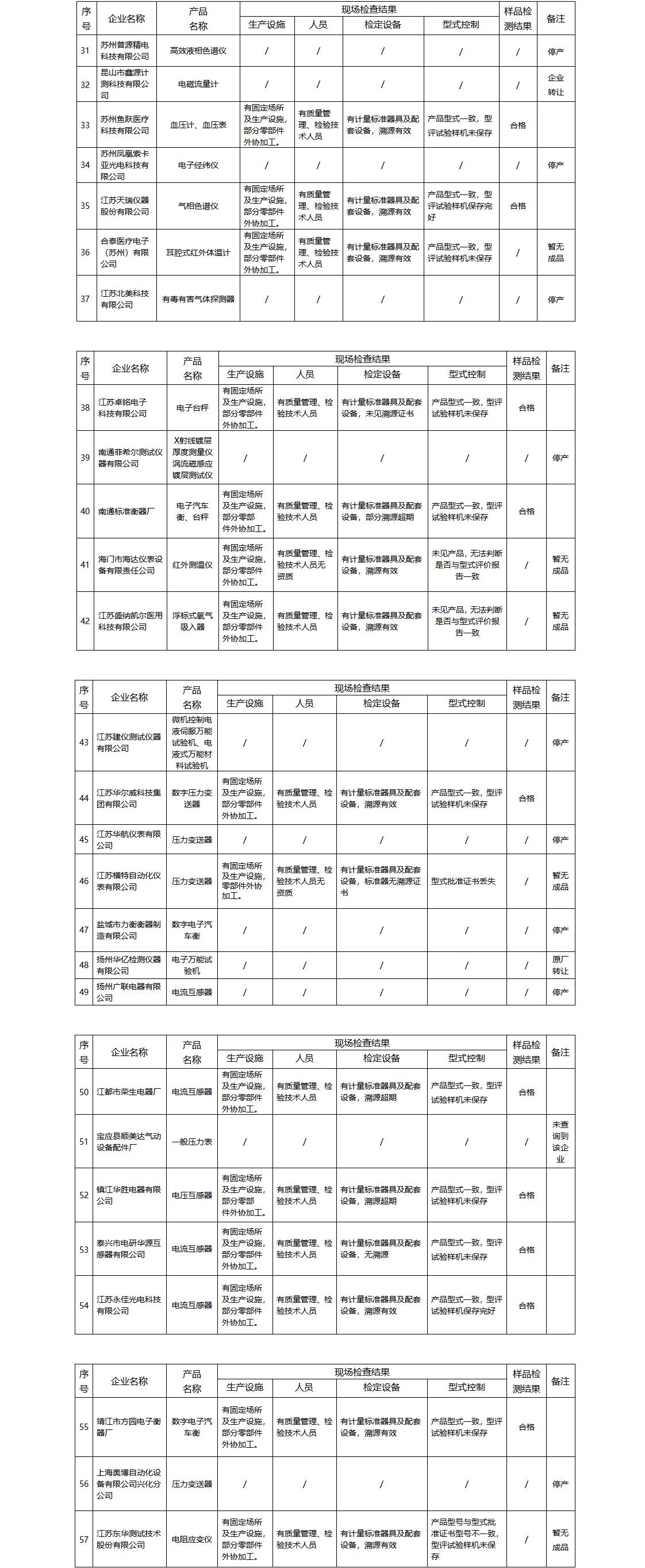 經(jīng)查,16家企業(yè)處于關(guān)停并轉(zhuǎn)狀態(tài),現(xiàn)場檢查了處于正常生產(chǎn)狀態(tài)的41家企業(yè)的生產(chǎn)和型評相關(guān)情況。因計量器具的生產(chǎn)多是根據(jù)訂單需求生產(chǎn)而沒有庫存產(chǎn)品,所以部分企業(yè)未能現(xiàn)場抽樣,本次檢查共抽檢樣品32批次。