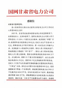 此次評價工作的順利完成,是甘肅省計量研究院服務地方經(jīng)濟發(fā)展、履行法定計量職責的生動體現(xiàn),也彰顯了本院在電能計量領域的專業(yè)能力與責任擔當。收到感謝信后,全院干部職工備受鼓舞。院相關負責人表示,這份贊譽既是肯定更是責任,未來,甘肅省計量研究院將繼續(xù)秉持 “精準計量、服務發(fā)展” 的宗旨,持續(xù)深化與國網(wǎng)甘肅省電力公司的戰(zhàn)略合作,在智能電網(wǎng)計量、新能源計量監(jiān)測等前沿領域加大技術研發(fā)力度,不斷提升服務效能與專業(yè)水平,以更優(yōu)質(zhì)的計量技術服務護航區(qū)域能源安全,為甘肅經(jīng)濟社會高質(zhì)量發(fā)展注入計量力量。