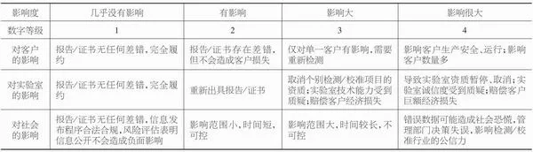 風險對客戶預期的影響,可從以下兩方面來考慮:(1)所檢設備/產(chǎn)品的用途。若用于安全,數(shù)據(jù)失準將造成安全事故,則影響大;用于并行監(jiān)測,影響相對小。(2)測量結果的用途。例如,設備/產(chǎn)品是按符合性結論使用還是按所報告的測量數(shù)據(jù)使用??蛻羲蛯嶒炇倚实膬x器,有的按最大允許誤差使用,有的按修正值使用,前者即使數(shù)據(jù)錯誤也可能不影響誤判,后者只要存在差錯,錯誤數(shù)據(jù)就會“傳遞下去”,因此后者給客戶造成影響的可能性更大。潛在問題的檢出度是指在實驗室管理中被發(fā)現(xiàn)的難易程度,其評級如表3所示。